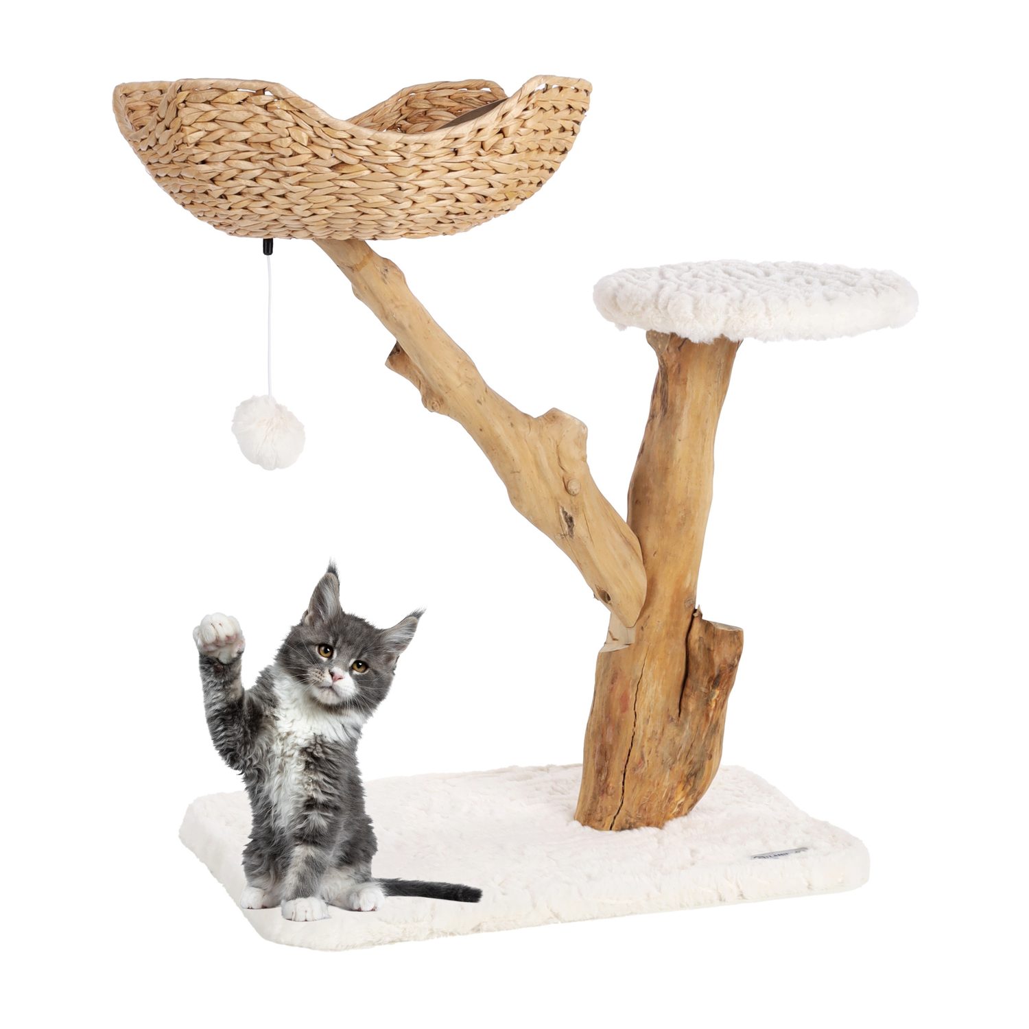 Give your cat a place to play and relax with the Flamingo Carlito scratching post! Made from coffee tree wood and soft plush (510 g/m²), with a removable cushion and toy for entertainment. Ideal for pampered cats.